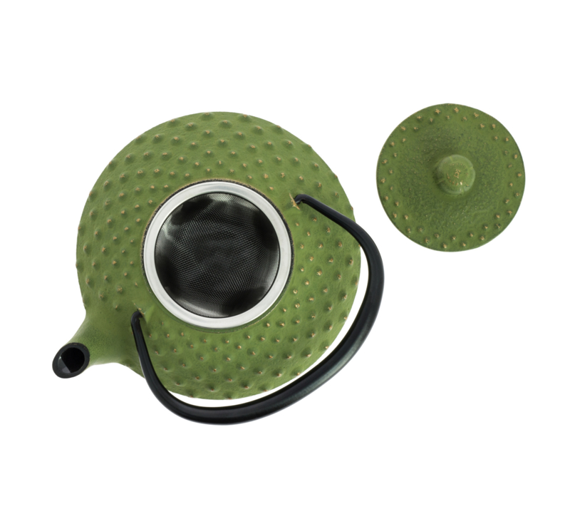 Cast iron, enamelled in the inside, with stainless tea strainer