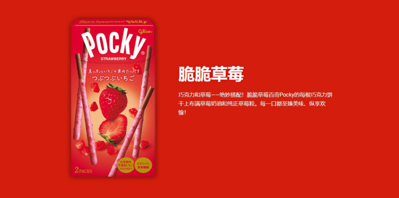 De befaamde Japanse pocky. Deze snack bestaat uit een krokante biscuit stokje met aardbeiensmaak. Dit doosje bevat 2 verpakkingen. In Japan is Pocky een zeer populaire lekkernij en wordt veelvuldig gegeten. De Japanners hebben zelfs 11 november tot officiële Pocky dag uitgeroepen.